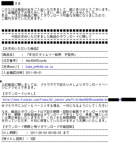 お支払いが終了すると、ダウンロードの情報が記載されたメールが届きます。メールに記載されている商品内容をご確認下さい。