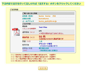 ご購入商品の最終確認をします。明細を確認して「注文する」をクリックして下さい。 |